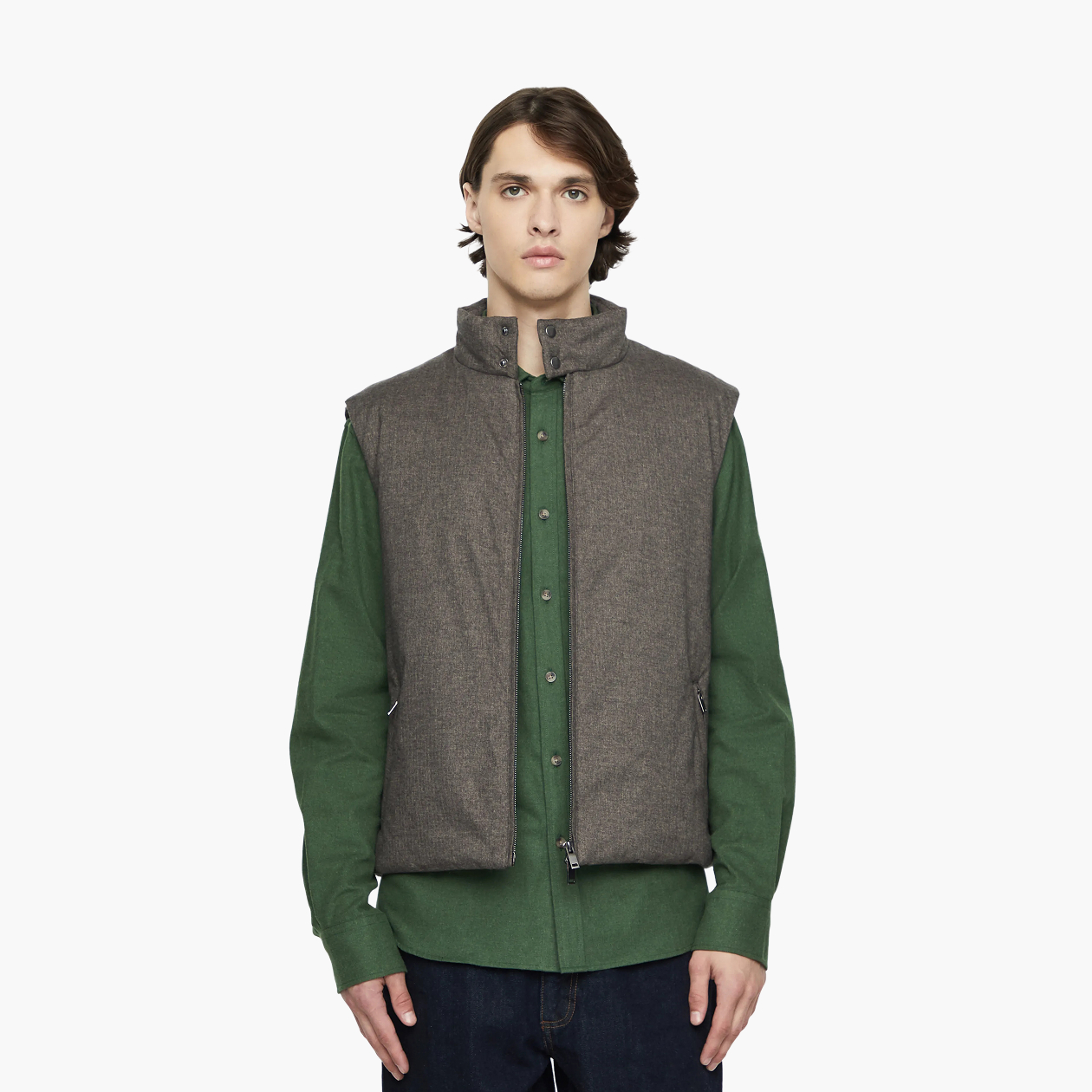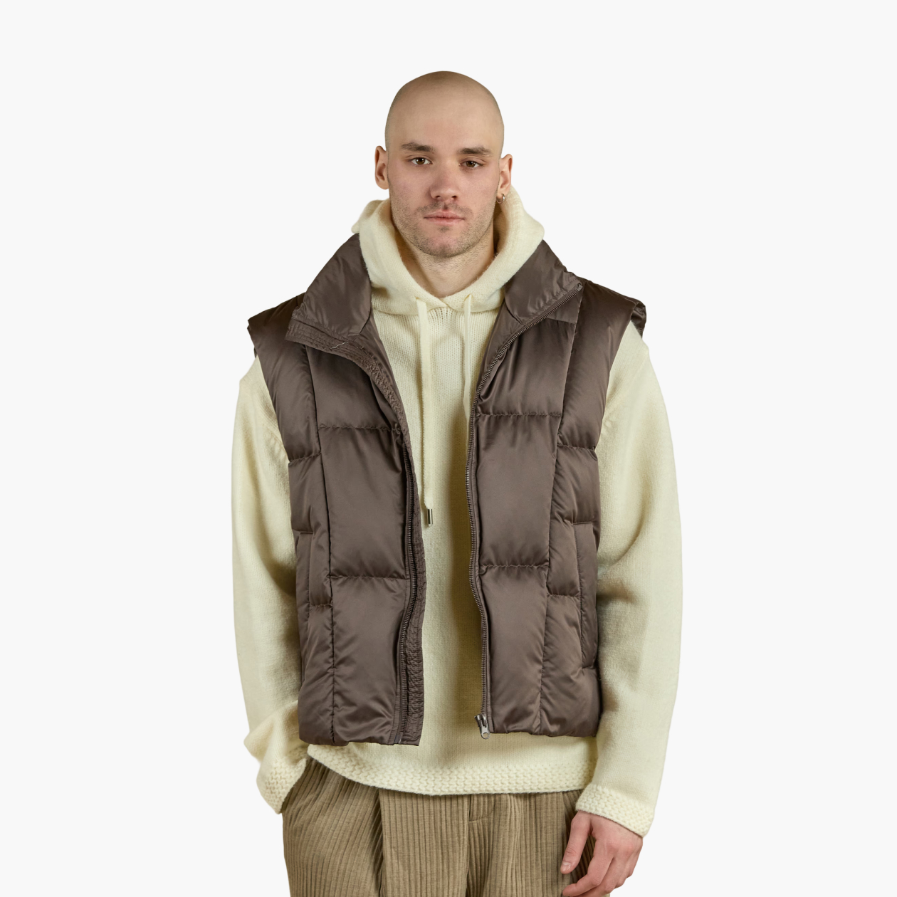 Стеганая подстежка — чуть более лаконичный вариант, чем ее флисовый аналог. Однотонный жилет с тонким слоем синтепона или пуха внутри хорошо дружит с тренчами и классическими пальто. А если хочется небазовый вариант, выбирайте тонкие жилеты в азиатском стиле.