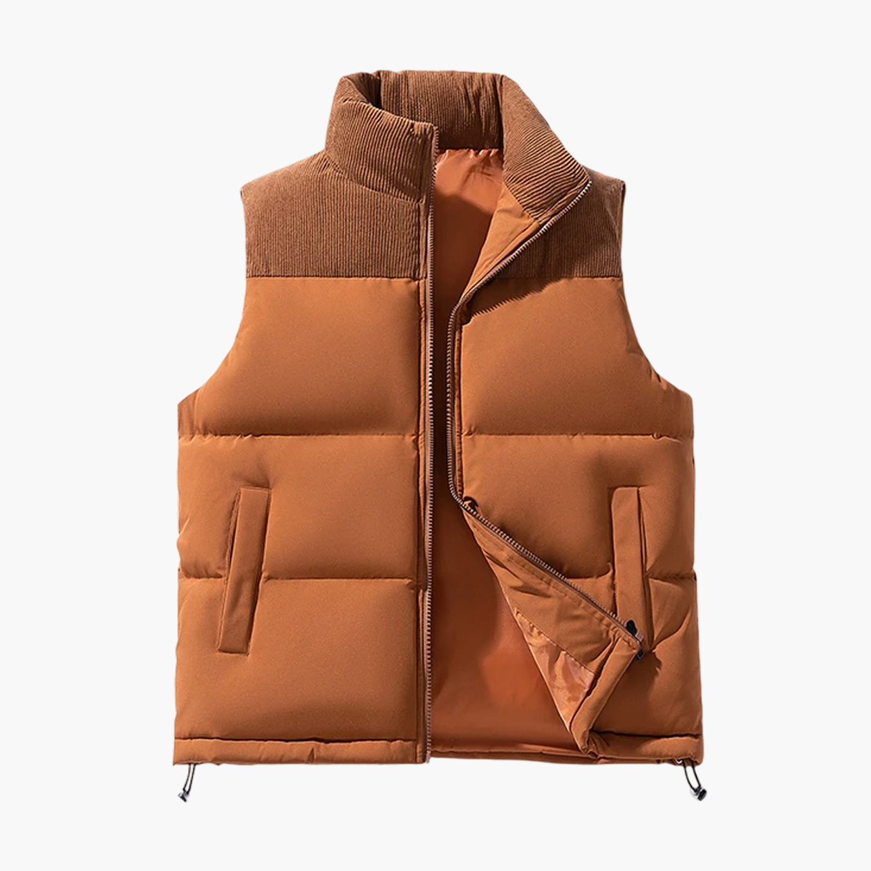 Буквально пуховик, только без рукавов, так что можно смело зачислять его в категорию зимней верхней одежды, если вы перемещаетесь на авто.