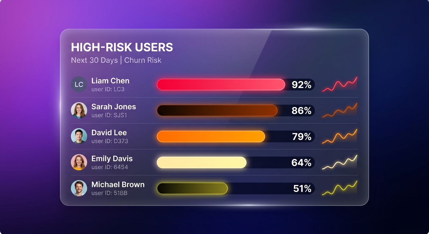 - AI анализирует поведение (логины, использование фич, посещения)