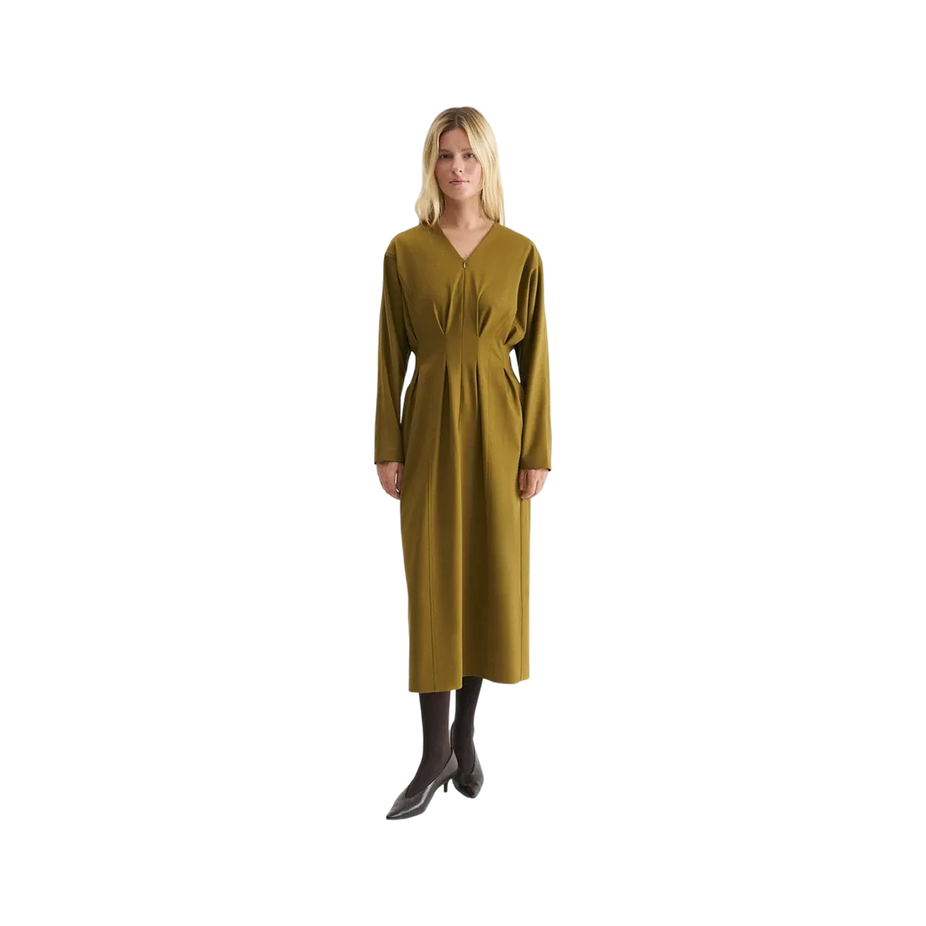 Для офисных луков зимой подойдет платье-миди с длинными рукавами из костюмной ткани или твида. Если на работе нестрогий дресс-код, можно выбрать модель сложного оттенка, например оливкового.