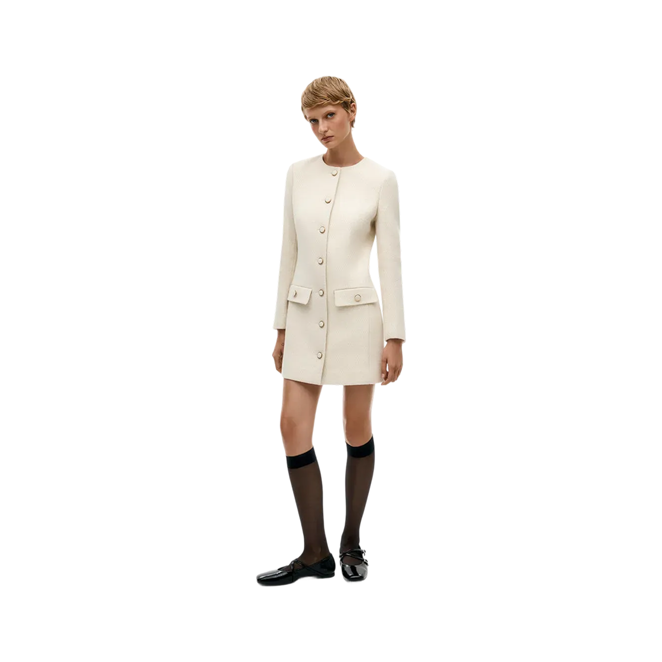 Вот как выглядит идеальное зимнее платье мини: свободный силуэт, длинные рукава или широкая пройма (для теплого первого слоя), плотный материал, например твид. Самый простой способ стилизации этого фасона — с однотонными сапогами до колена и колготками в цвет обуви.