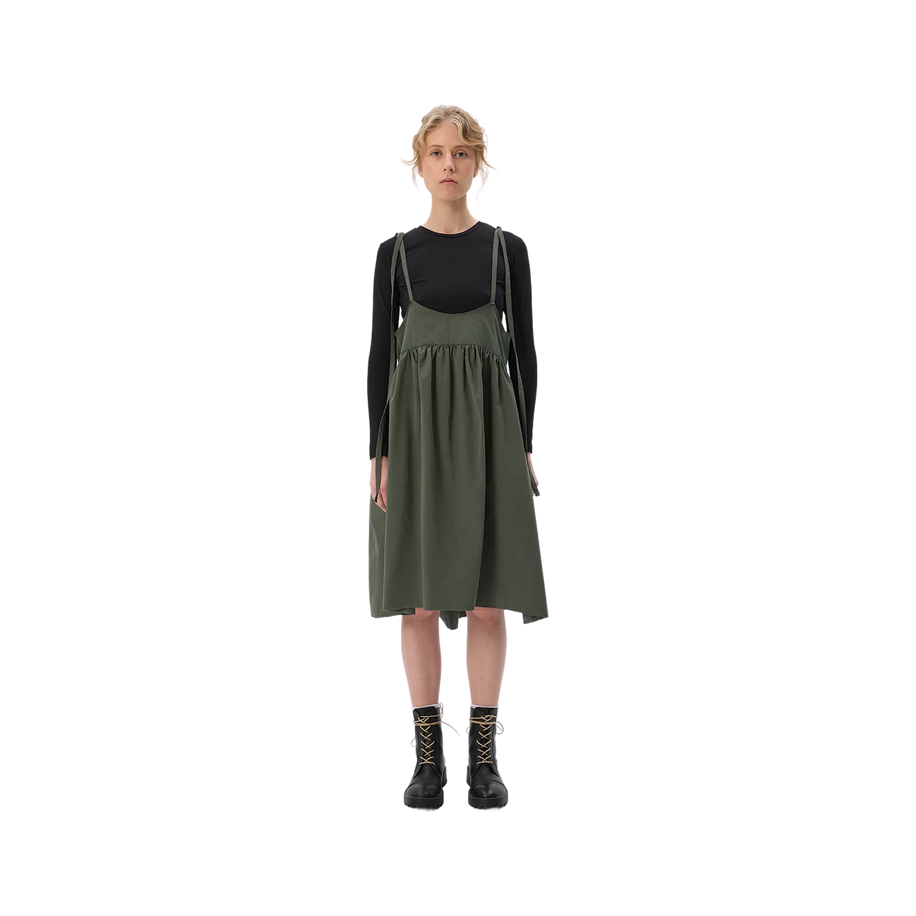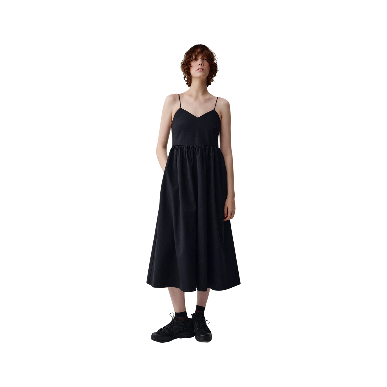 Такие платья обычно носят летом, а мы предлагаем найти в гардеробе самое скромное — и попробовать надеть его с рубашкой или лонгсливом, колготками или легинсами и ботинками-хайкерами или кроссовками в аутдор-стиле.