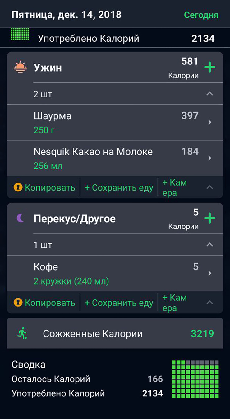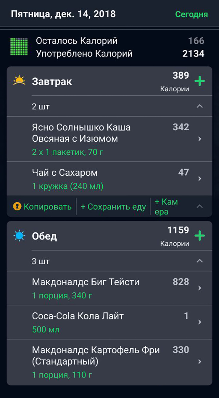 До похудения мой дневной калораж был 3 000—3 700 ккал. Я снизил его до 2 100—2 200 ккал. Учет калорий вел в приложении FatSecret: выбрал его, потому что встречал в рекомендациях большинства статей, которые читал.