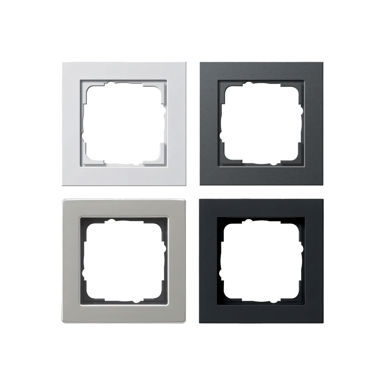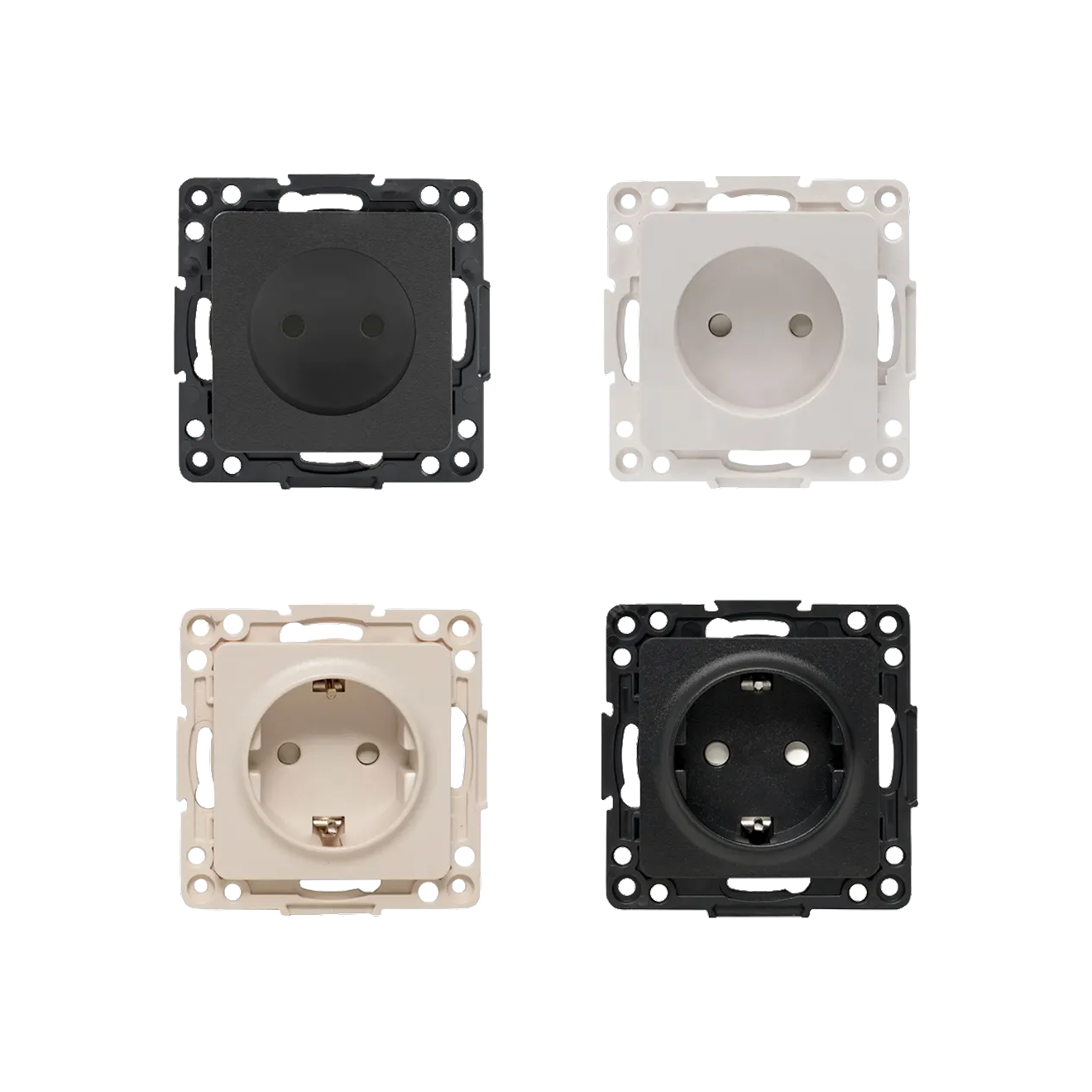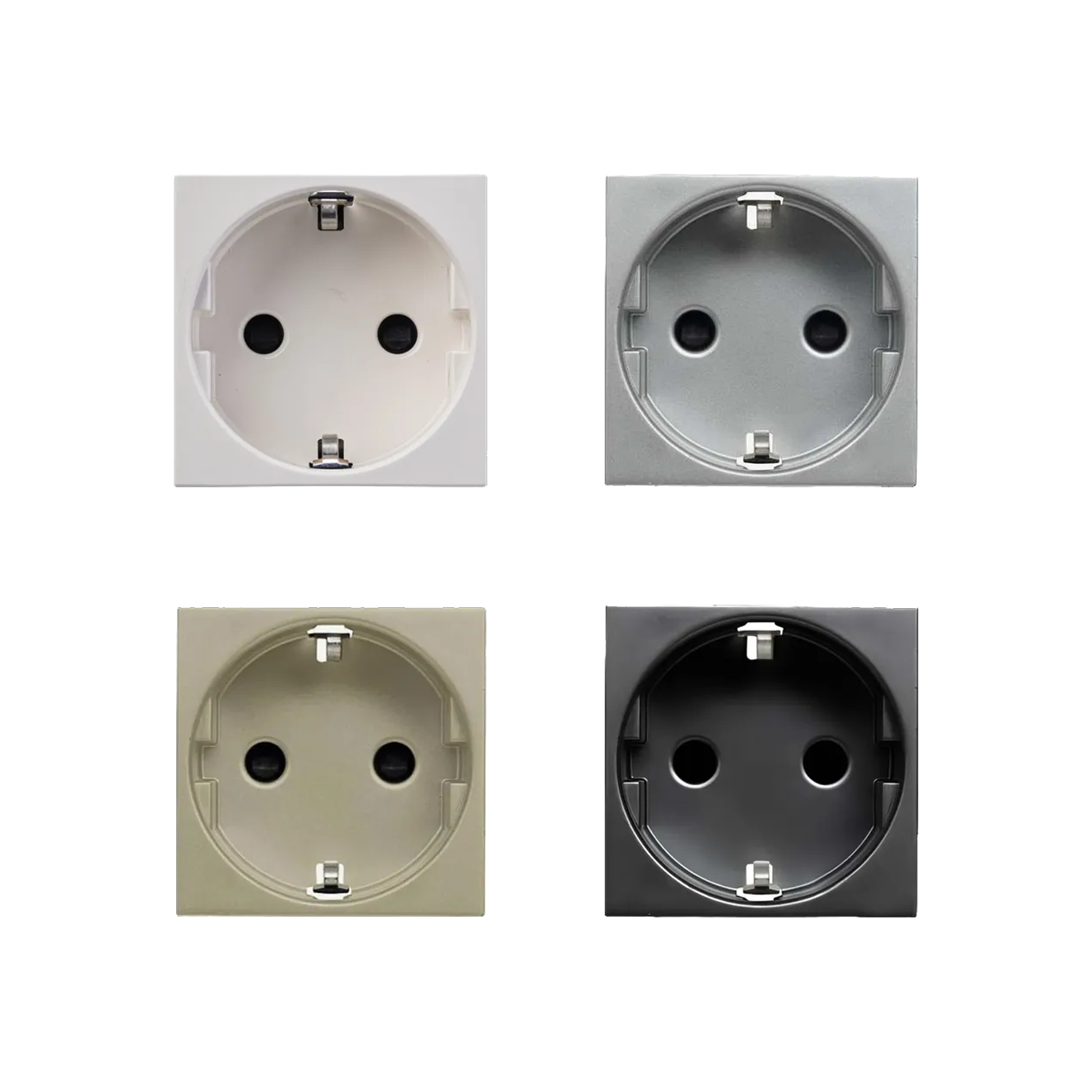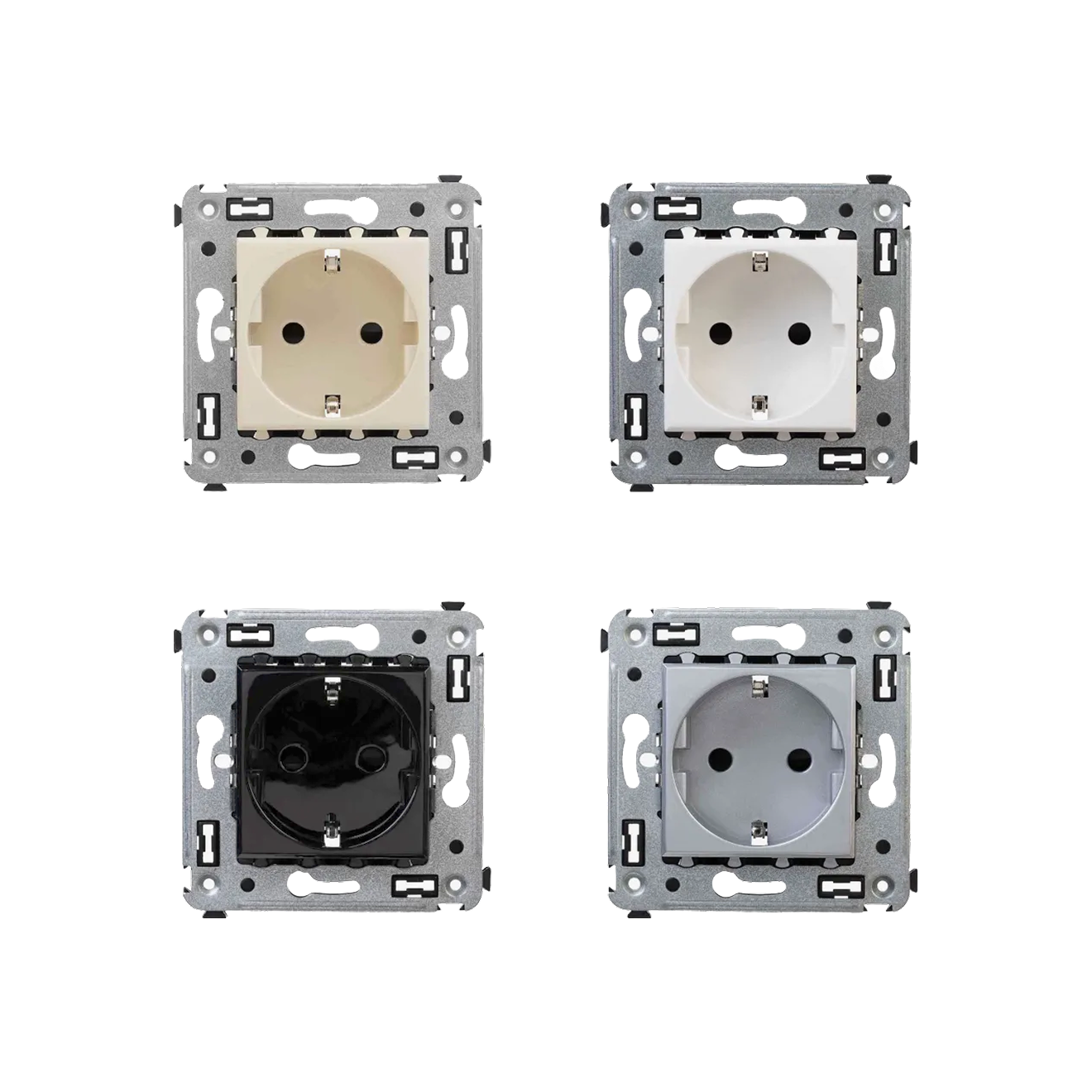 Серия E2 включает розетки для встроенного монтажа с количеством постов от одного до пяти и самозажимными клеммами. Механизмы и рамки выполнены из пластика и стали и представлены в одинаковых цветах: белом глянцевом и матовом, черном матовом, матовом антраците, стали, сером матовом и матовом алюминии. В линейке есть модели с защитой IP20 и IP44, а также варианты со шторками, крышками или без них.