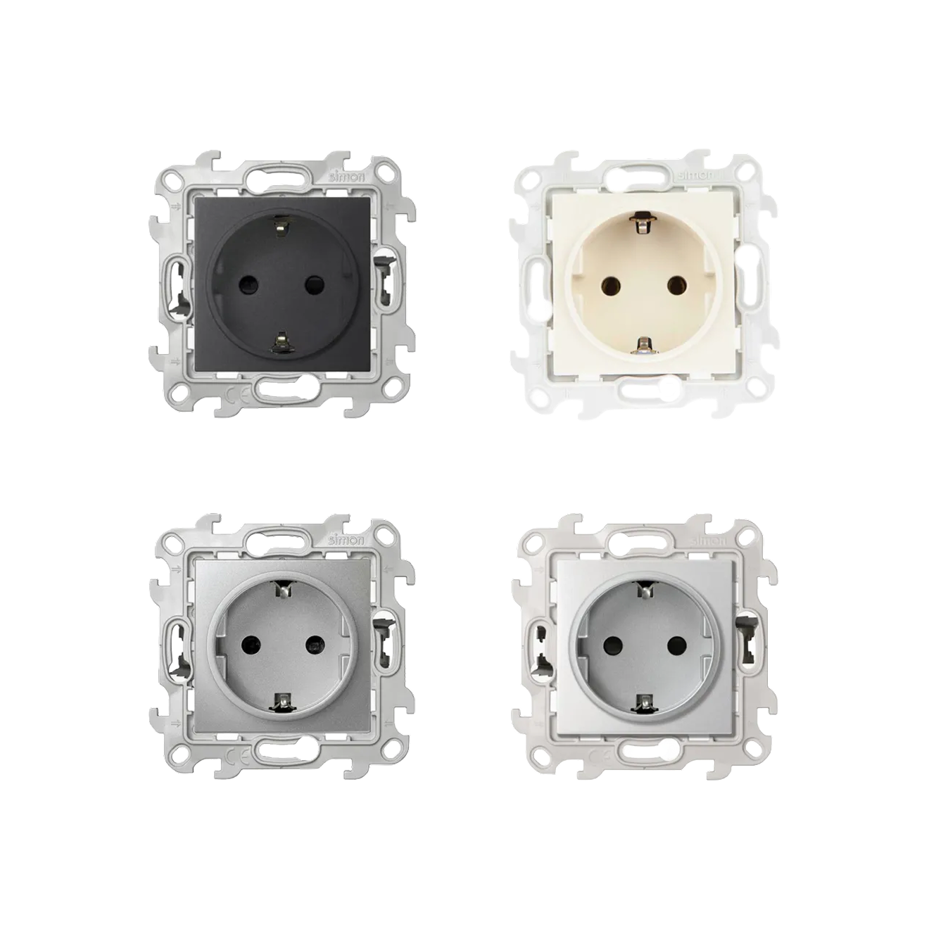 Один из примеров — серия Simon 24 Harmonie, она включает розетки для встроенного монтажа с возможностью установки до пяти постов в одной рамке. Механизмы оснащены самозажимными клеммами, выполнены из пластика и доступны в четырех цветах: белом, цвете слоновой кости, алюминии и графите. Рамки представлены в шести цветах — дополнительно доступны варианты в золоте и шампани. В линейке есть модели со степенью защиты IP20 и IP40, а также варианты с защитными шторками.