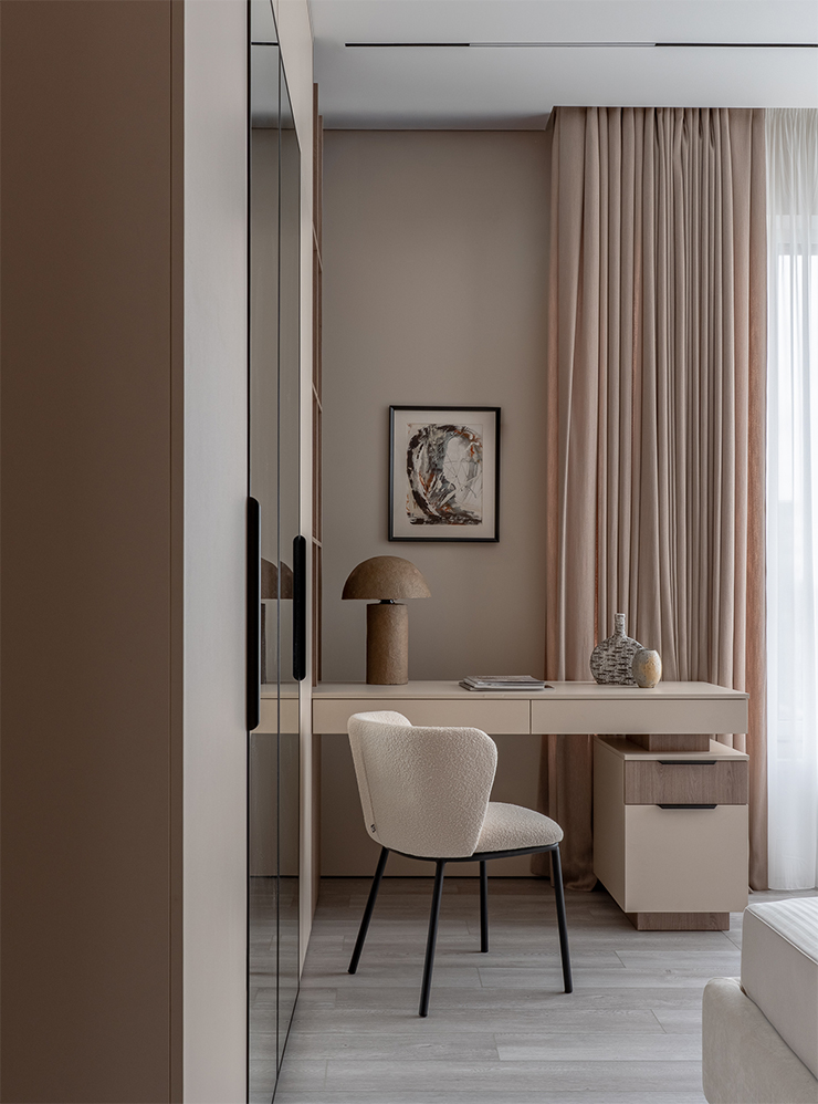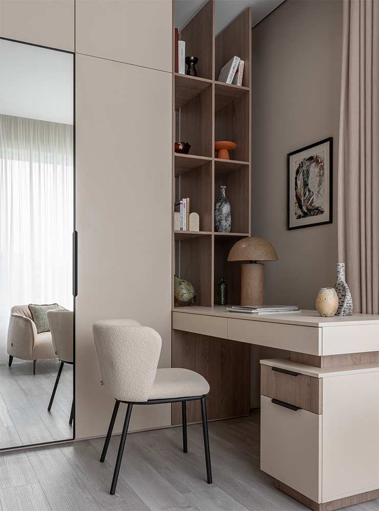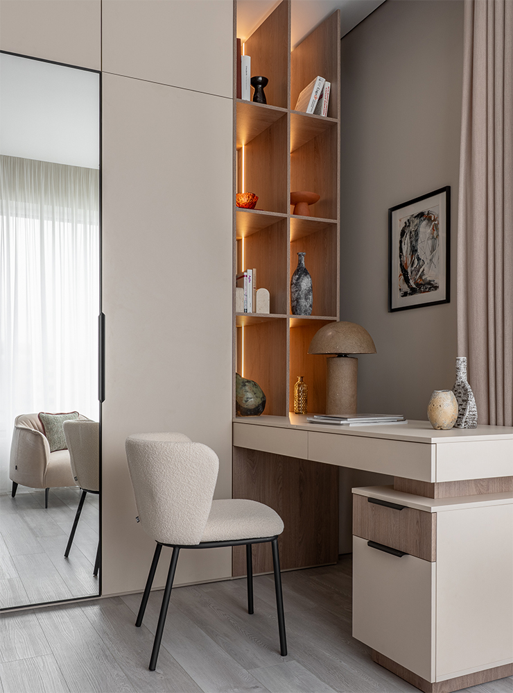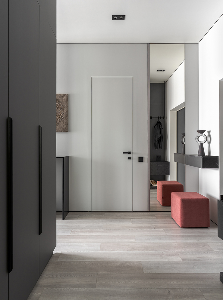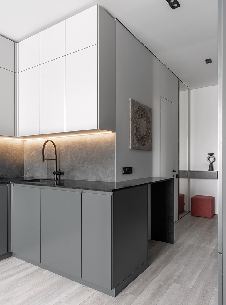 Второй способ добавить акцент — использовать натуральную фактуру. Для серых интерьеров хорошо подойдет темное дерево с теплым подтоном. Обратите внимание, что пол во всей квартире светло-серый, а акцентная мебель и панели контрастируют с ним.