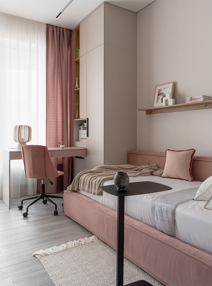 Розовые детали можно применять в текстиле: шторах, обивке мебели, покрывалах. Обилие текстиля приглушает минимализм серых оттенков.