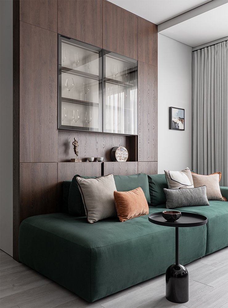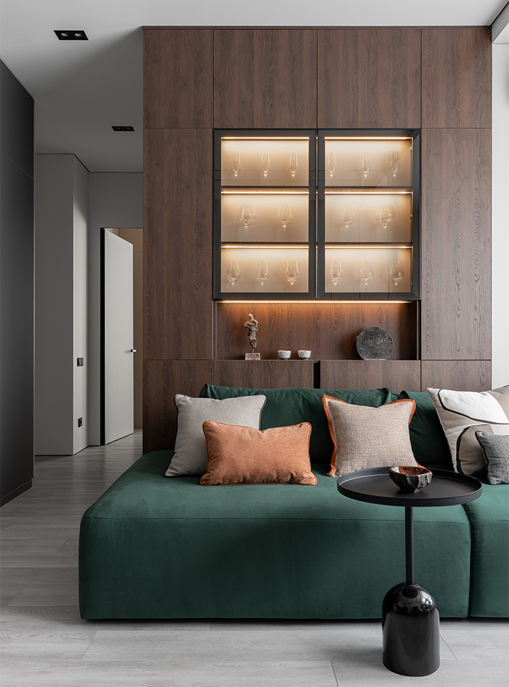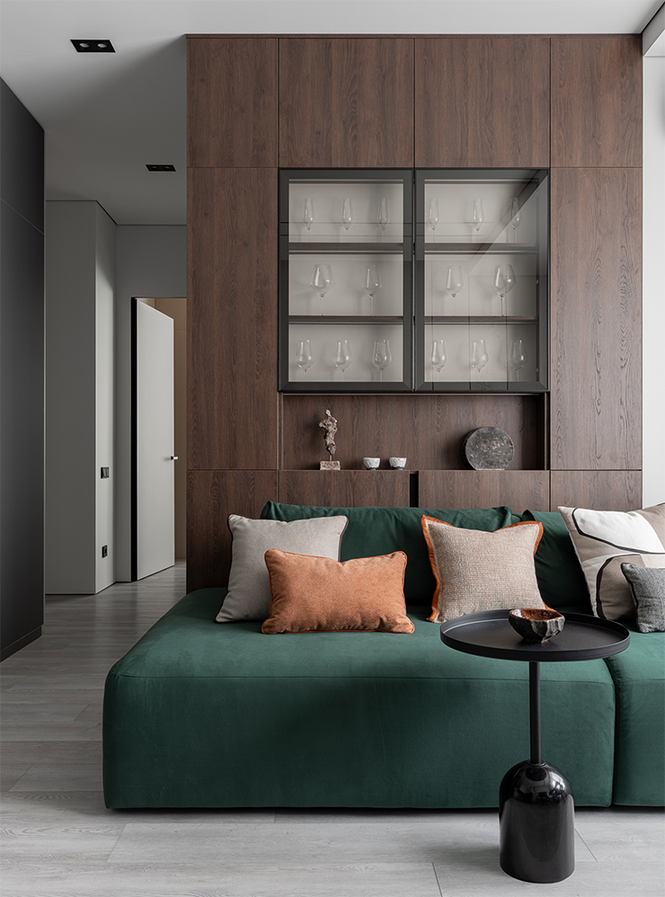 Сочетание зеленого цвета и дерева используется один раз, потому что цвета занимают большой объем. Если бы стена была нейтральной, понадобилось бы больше ярких и фактурных предметов, чтобы компенсировать диван.