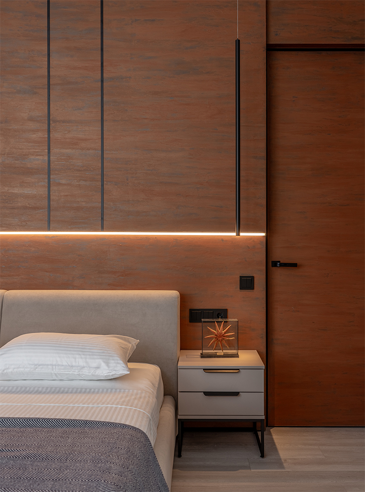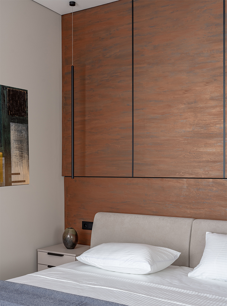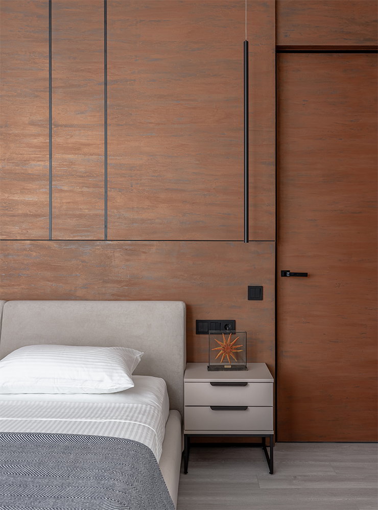 В спальне для акцента выбрали деревянные панели с оранжевым подтоном, более яркие, но не с такой выраженной текстурой. На таком изголовье не нужен дополнительный декор.