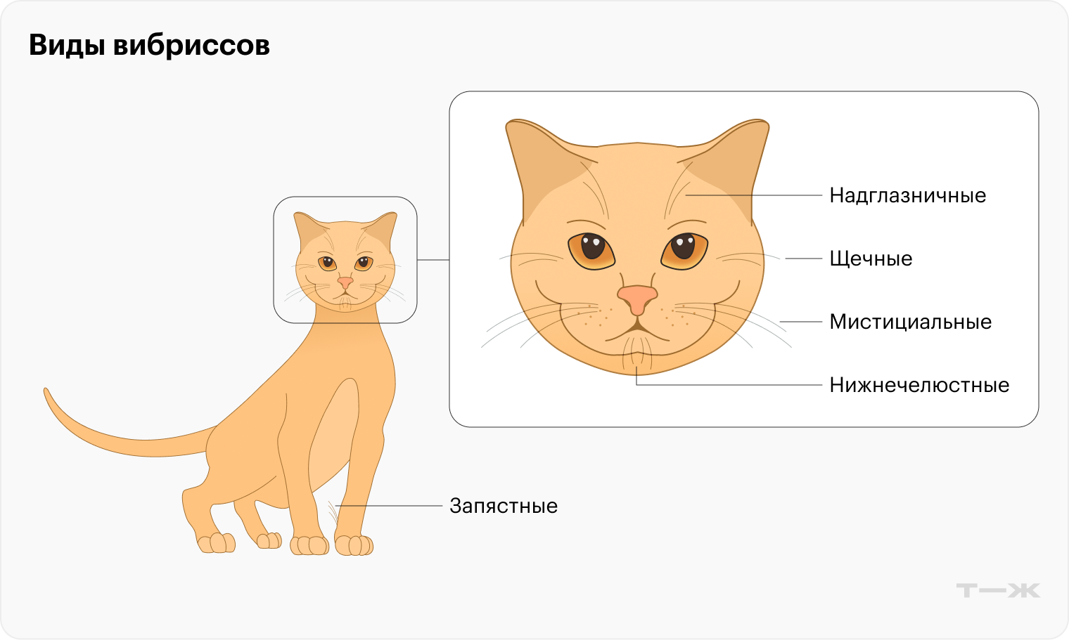 Устройство вибрисс отличается от структуры мехового покрова — они толще и грубее волос. Вибриссы расположены не только на щеках кошки, но и над глазами, на подбородке и на задней поверхности лап.