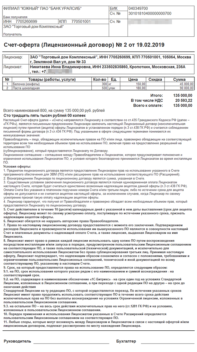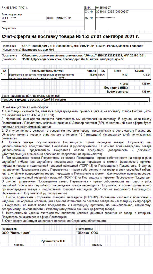 При выставлении счета-оферты стороны могут обойтись без подписания отдельного договора. Оплата счета-оферты означает безоговорочное согласие со всеми его условиями.