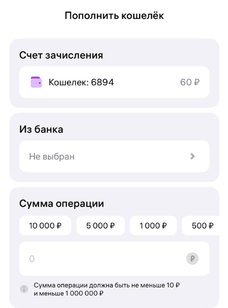 Пополнить кошелек возможно только одним способом — через СБП. Здесь все работает стандартно: