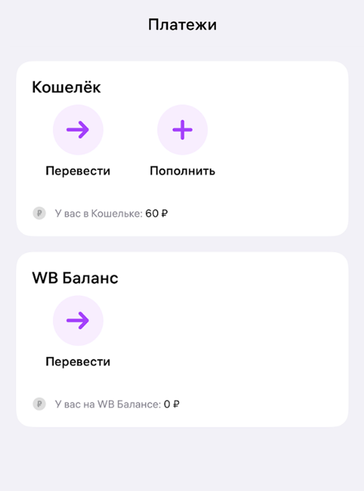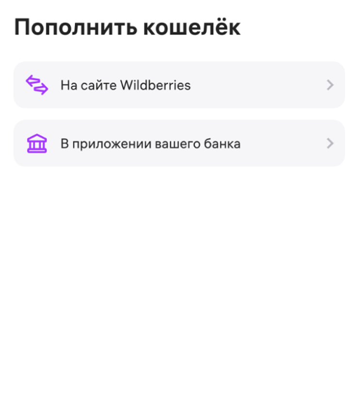 - При пополнении через Balance Pay на смартфоне пользователя должно быть приложение банка. Если его нет, пополнить WB Кошелек таким способом не получится — только через личный кабинет и на сумму до 100 000 ₽.