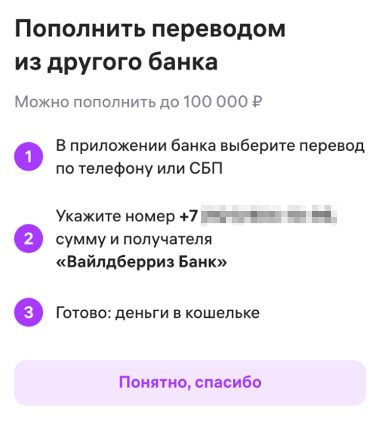 При этом при пополнении кошелька через личный кабинет маркетплейса можно зачислить до 100 000 ₽.