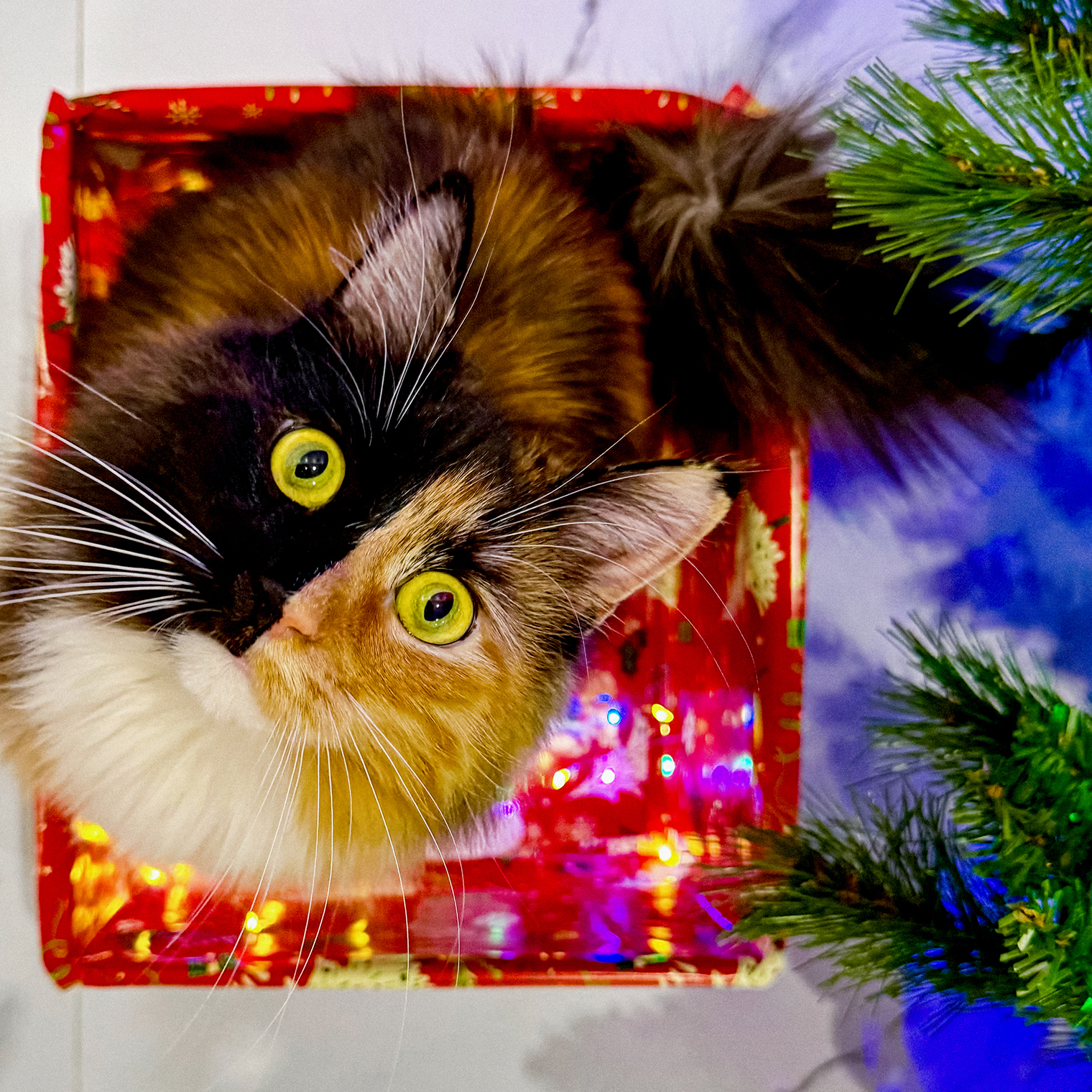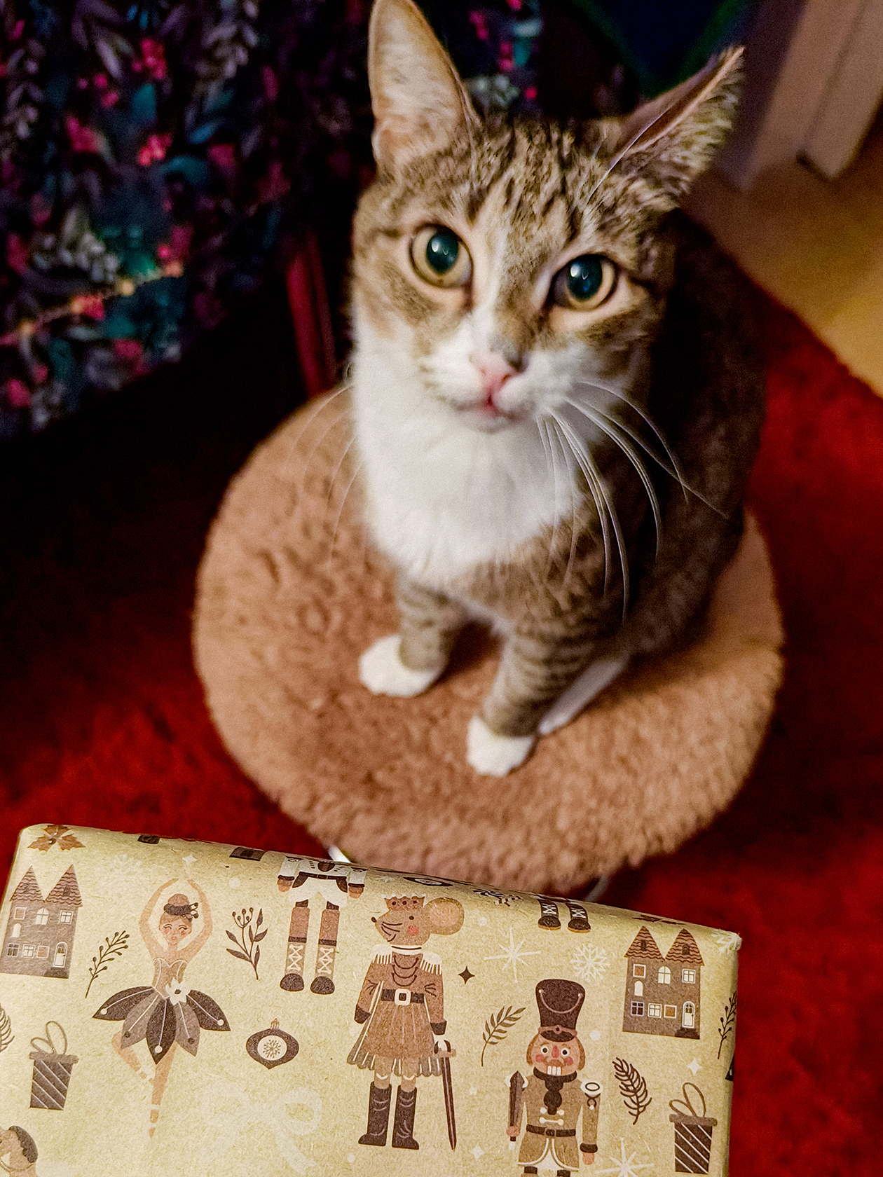 Кот очень ждал наступления Нового года. Знает, что, если праздник с елкой, значит, будут подарки. Обычно от его подарков пахнет кошачьими вкусняшками, потому он без труда их находит