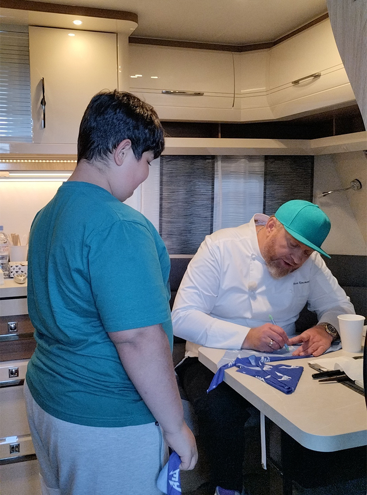 Несмотря на загруженность, Константин Ивлев нашел минуту, чтобы выйти к нам. Ведущий оказался не «адским» и грозным шефом, как в эфире, а очень душевным и внимательным человеком. Он пообщался с Сашей и подарил банданы с личным автографом и коробку с профессиональным мерчем: венчиком, ножом, фартуком, полотенцем, прихватками и мерными ложками.