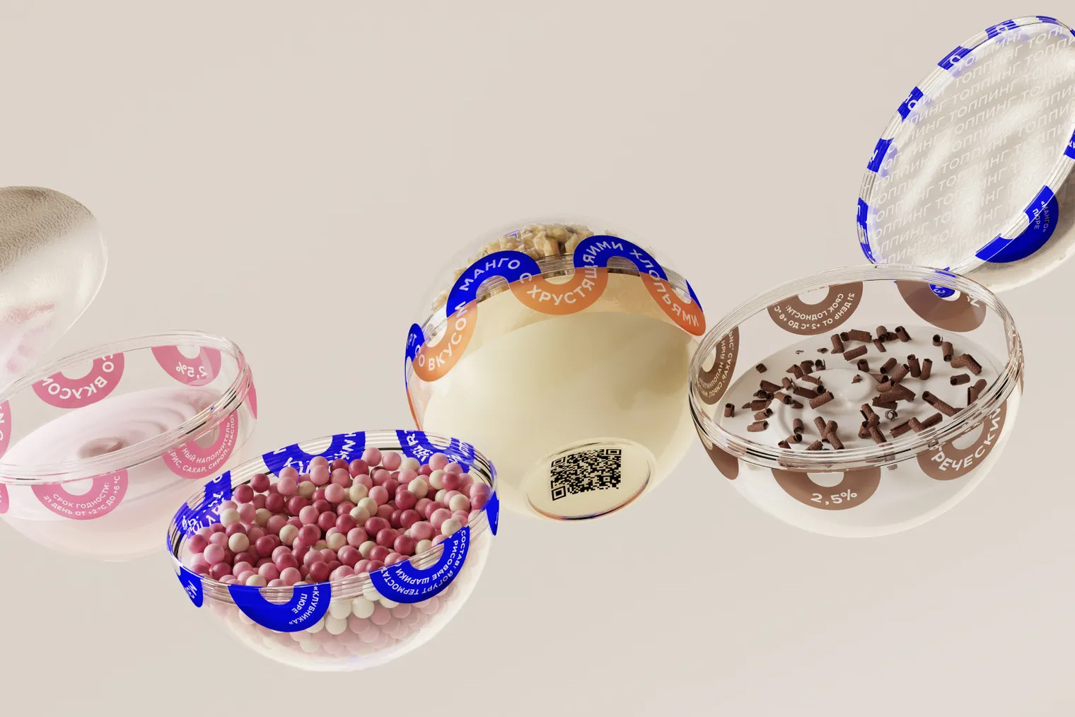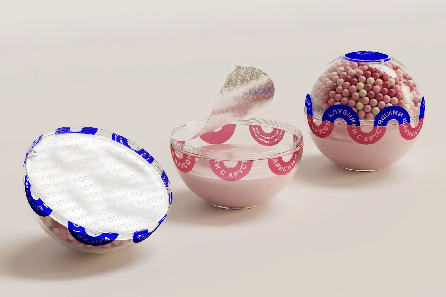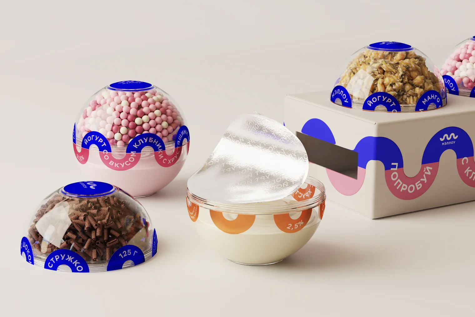 Мне как дизайнеру нужно было найти метафору этого проекта. В основе идеи — мысль о том, что есть вещи, которыми приятно делиться с близкими. Деление — это про дружбу, любовь, близость и совместные моменты. Отсюда появился формфактор : упаковка в виде сферы, которая разделяется на две части с содержимым внутри. Йогурт можно делить, смешивать вкусы и создавать новые сочетания.