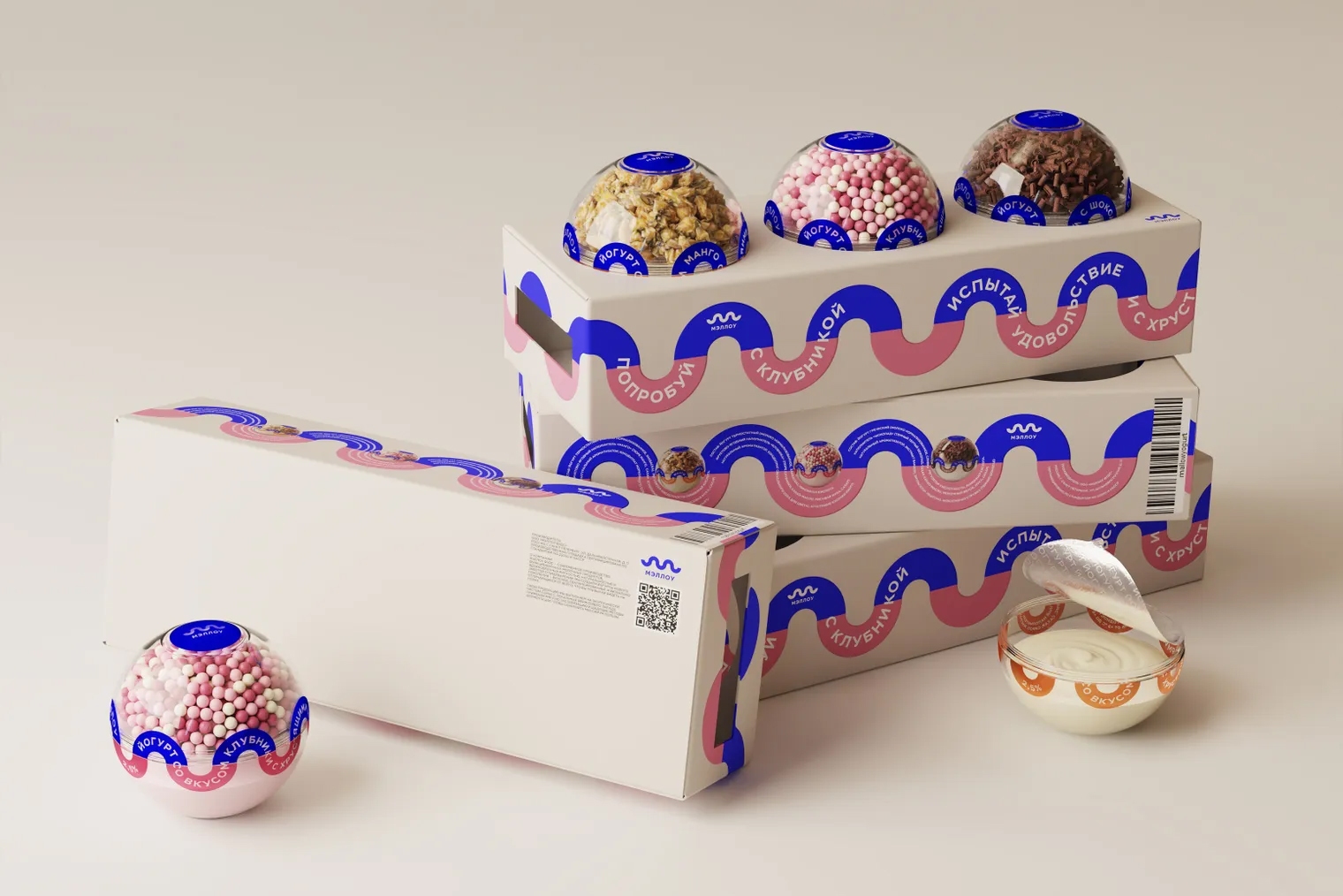 В 2025 году, уже на втором курсе магистратуры, я снова подалась на конкурс, но теперь с проектом по брендингу упаковки «Йогурт от Мэллоу». Этот проект тоже учебный — за его реализацию я благодарна Павлу Борисовскому как куратору и наставнику, а также Леониду Славину как руководителю программы «Арт-дирекшн», без которой не было бы ни моей учебы, ни проекта.