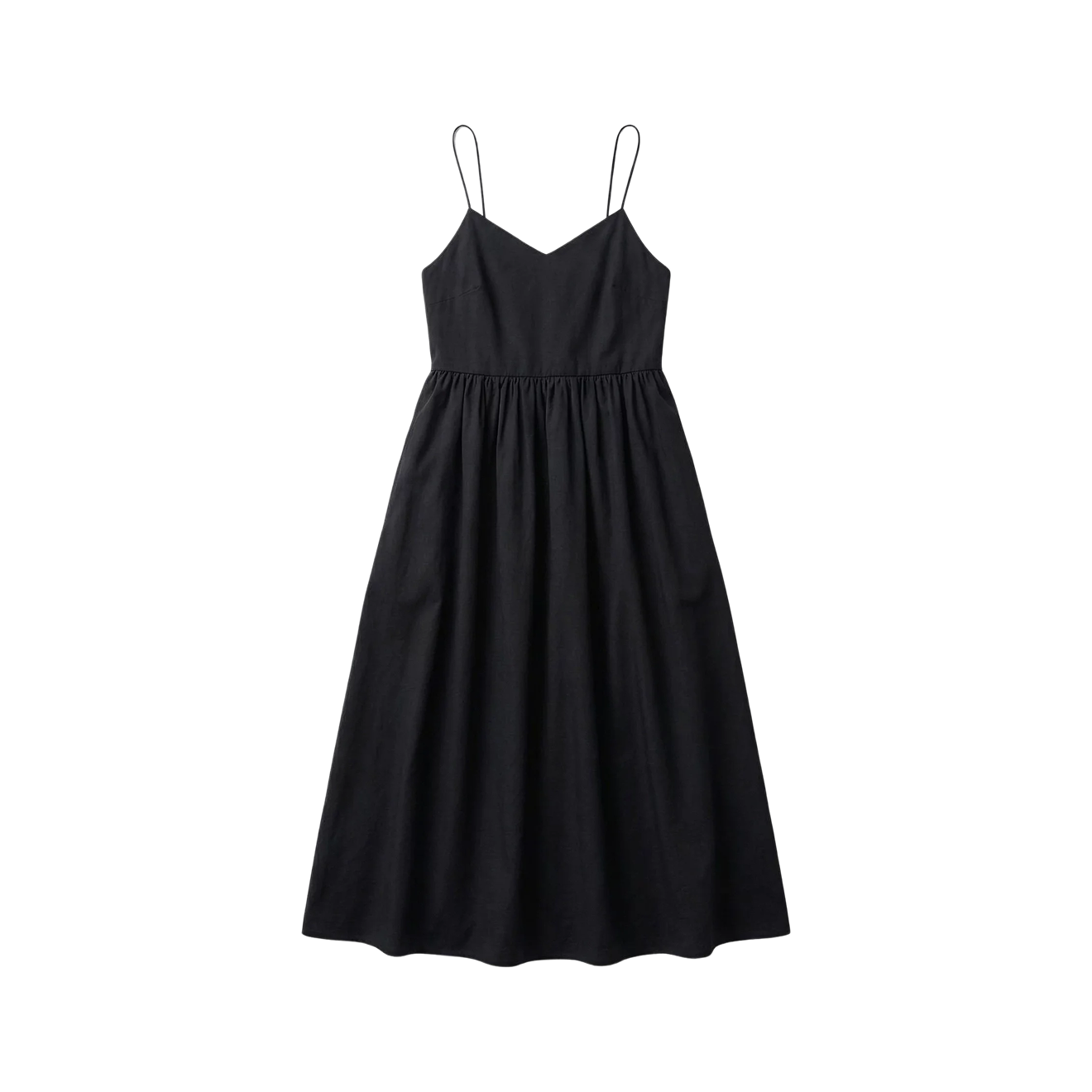 Однозначная звезда ассортимента — черное походное платье. Оно скроено так, чтобы одним шнуром можно было регулировать длину лямок и объем талии, сшито из смесовой ткани на основе хлопка и полиэстера, а еще может похвастаться глубокими карманами и размерной сеткой от S до XL.