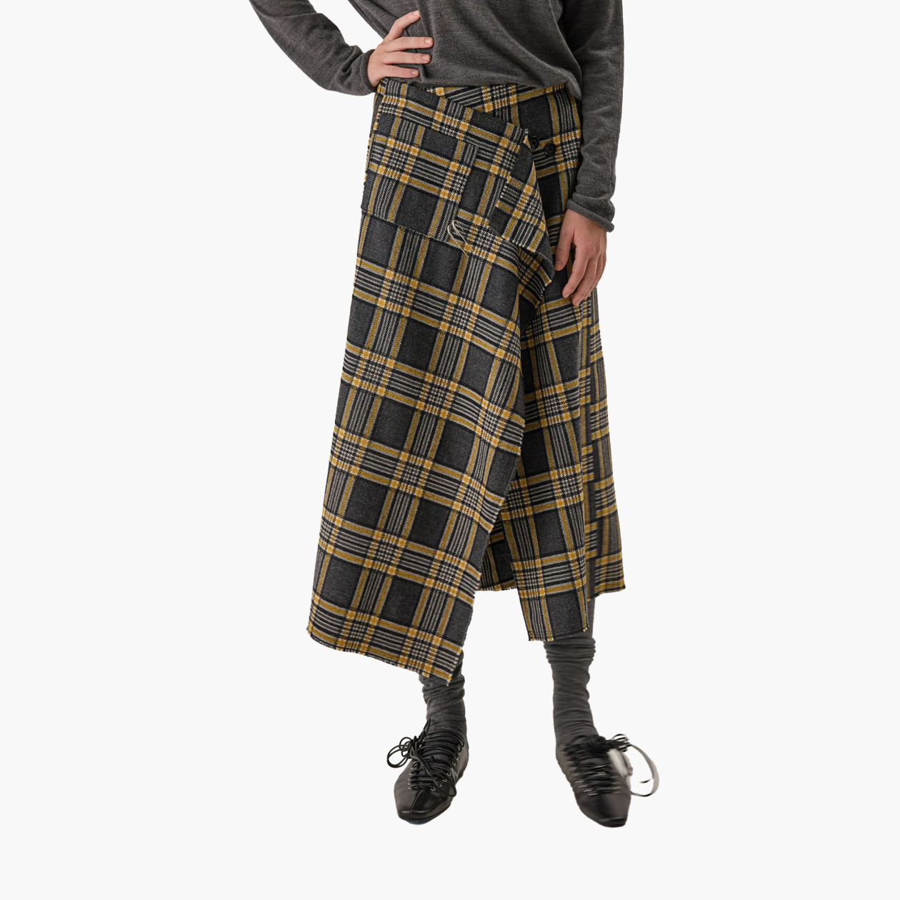 Юбки на запахе массово появились в коллекциях брендов еще в сезоне весна-лето 2025. Самые запоминающиеся примеры показал Miu Miu — модный дом выпустил яркие костюмные и кожаные юбки с глянцем. Тренд остался и на этот сезон — например, в коллекциях брендов Ami и Hermes тоже есть клетчатые и шерстяные юбки.