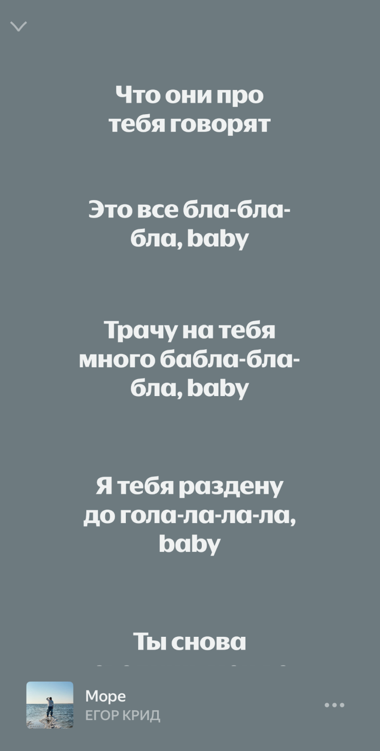 Под конец дня ехал в аэропорт на такси — и сквозь наушники услышал, что у таксиста играет My Name is Эминема. Очень захотелось выключить «Яндекс Музыку» и послушать настоящего Слима Шейди. Но нельзя, долг зовет. Включил плеер погромче, чтобы наш родной Егор Крид перекричал американского самозванца.