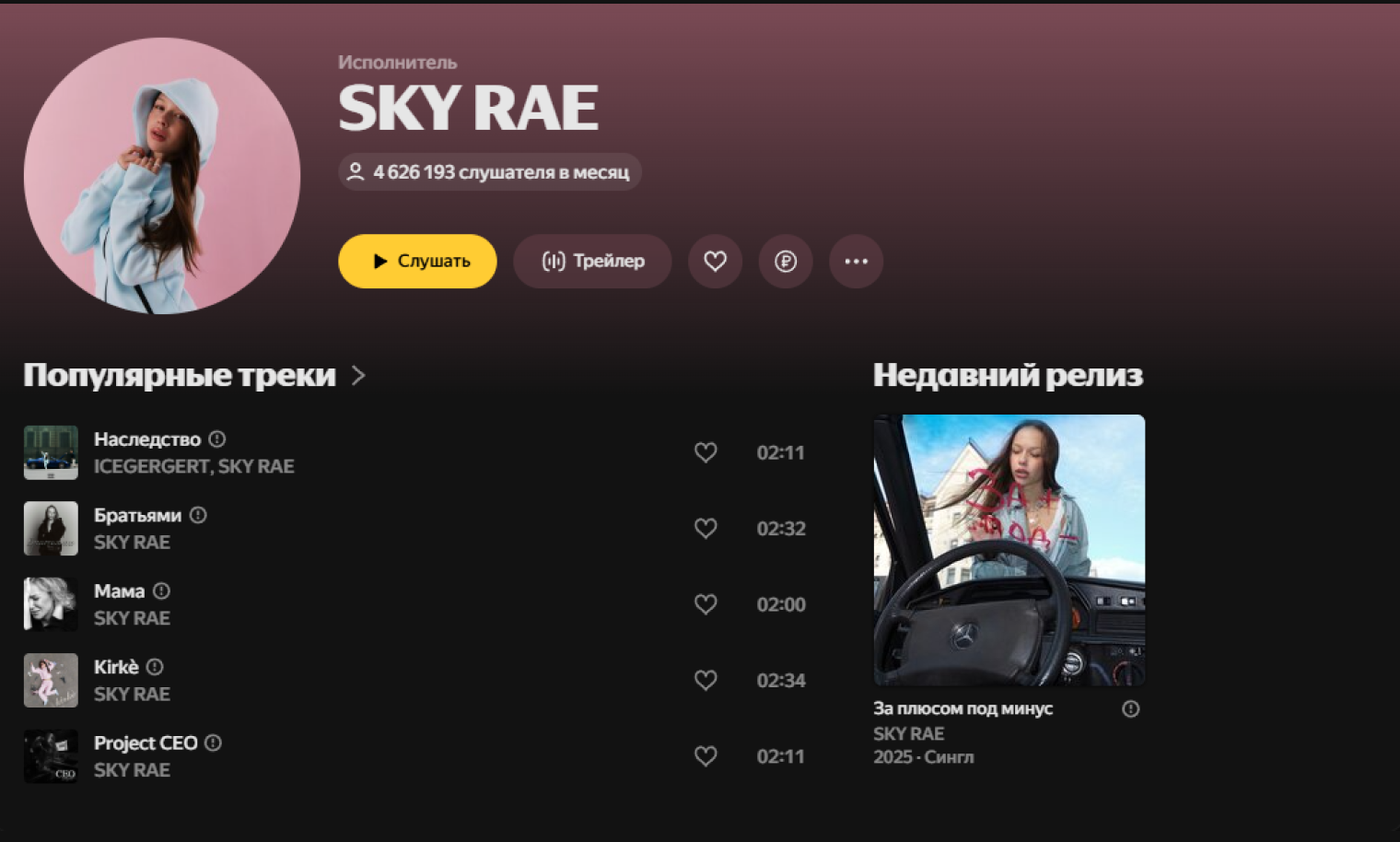 Не знаю, насколько эти данные отражают реальную популярность: может, в ход идут хитрые многоходовочки продюсеров, знающих, как работают алгоритмы «Яндекс Музыки». Но выглядит так, будто известность зарубежных звезд слабо конвертируется в их славу в России. Зачем нам Charli XCX и Бейонсе, когда есть Sky Rae? Кто бы это ни был.