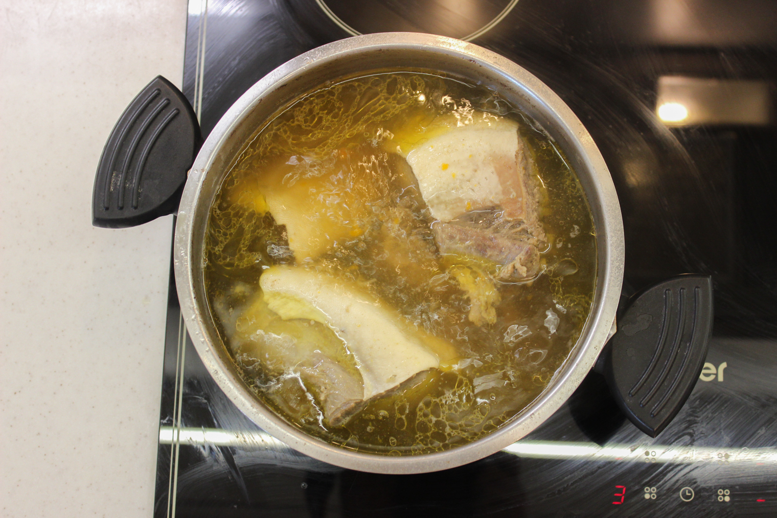 Шаг 3. Морковь разрежьте на 2—3 крупных части. Лук и морковь добавьте в бульон. Накройте крышкой и оставьте вариться на 2—4 часа на средне-слабом огне. Через 1—2 часа достаньте из бульона разваренные овощи.