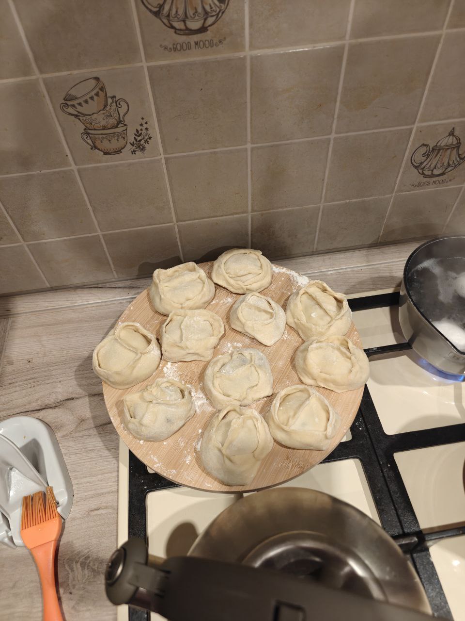 Манты мужа были со свининой, говядиной, картошкой и тыквой, а мои — с курицей, базиликом и тыквой. Лепили за 4 часа до нового года, было весело и вкусно.