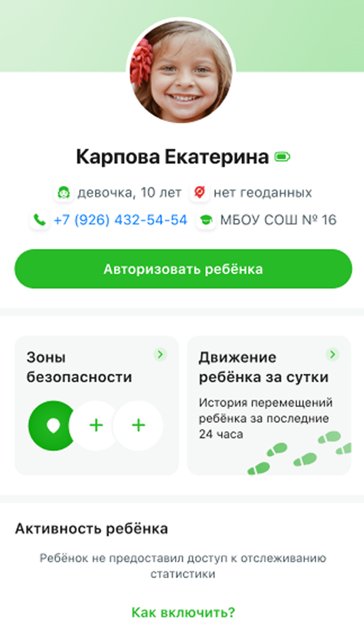 Папе и маме доступны местоположение и история перемещений ребенка за сутки. Также они получают уведомление о низком уровне заряда телефона, входе и выходе из зоны безопасности — так называют заранее выбранные места, где ребенок бывает регулярно. В их числе могут быть школа, детсад, спортивная секция или дом бабушки.