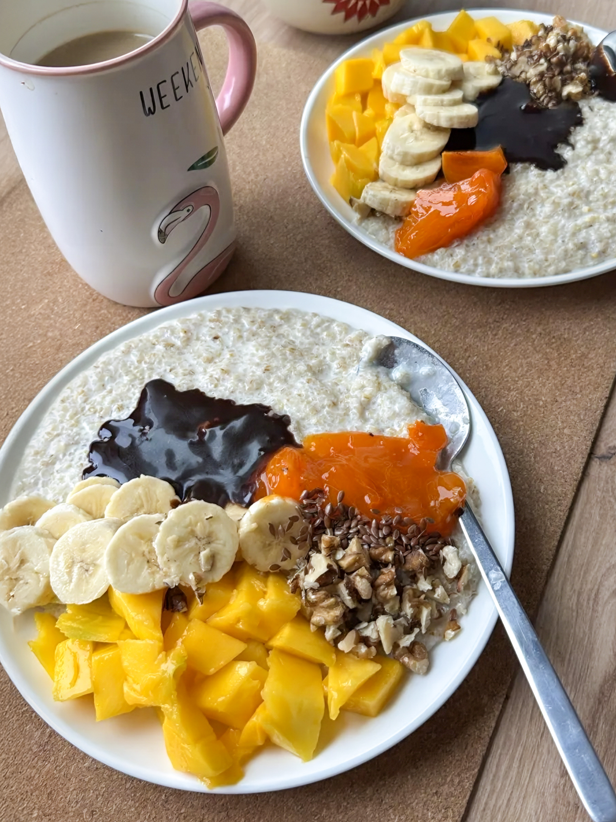 Шаг 3. Сервировать на свое усмотрение — можно добавить варенье и семена льна. Мне еще нравится добавлять к каше маракуйю — получается очень свеженько, а папе — мед и урбеч из расторопши .
