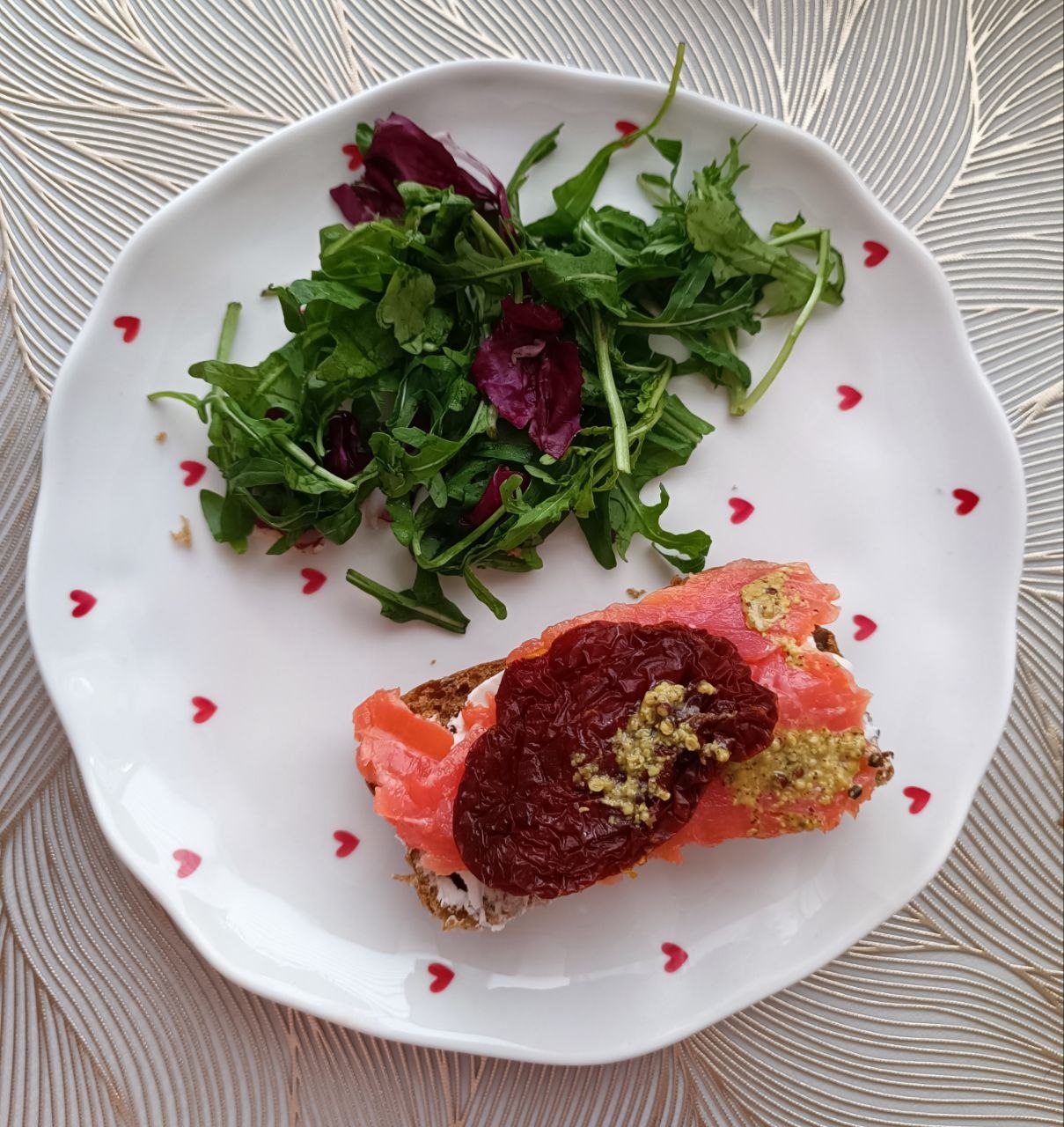 Сегодня решила сделать незамысловатый тост со слабосоленой форелью, тревожным сыром и вялеными томатами на зерновом хлебе. Сверху для пикантности — зернистая горчица, хотя она вообще не острая. Ну и весь завтрак разместился на моей любимой тарелке с сердечками:)