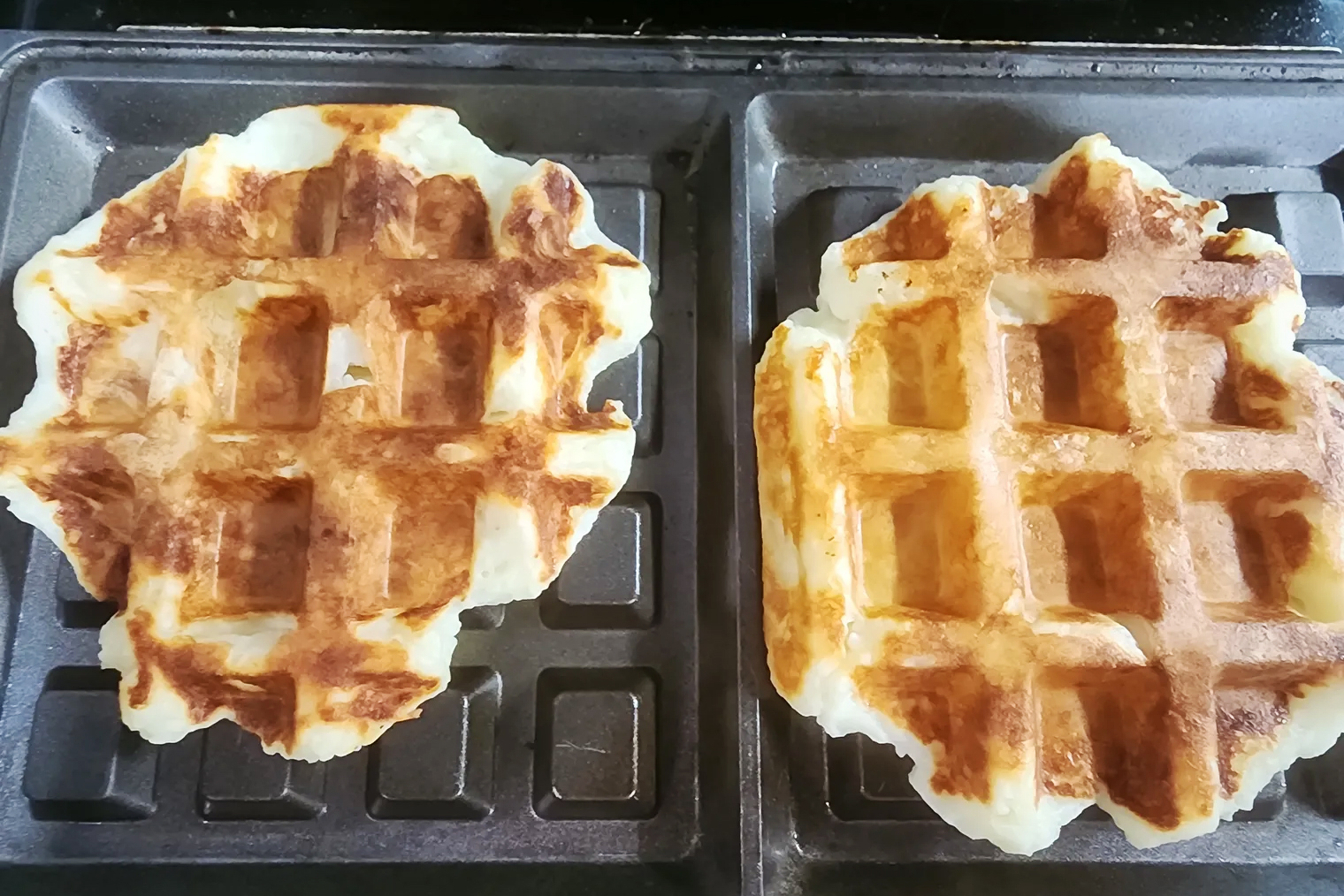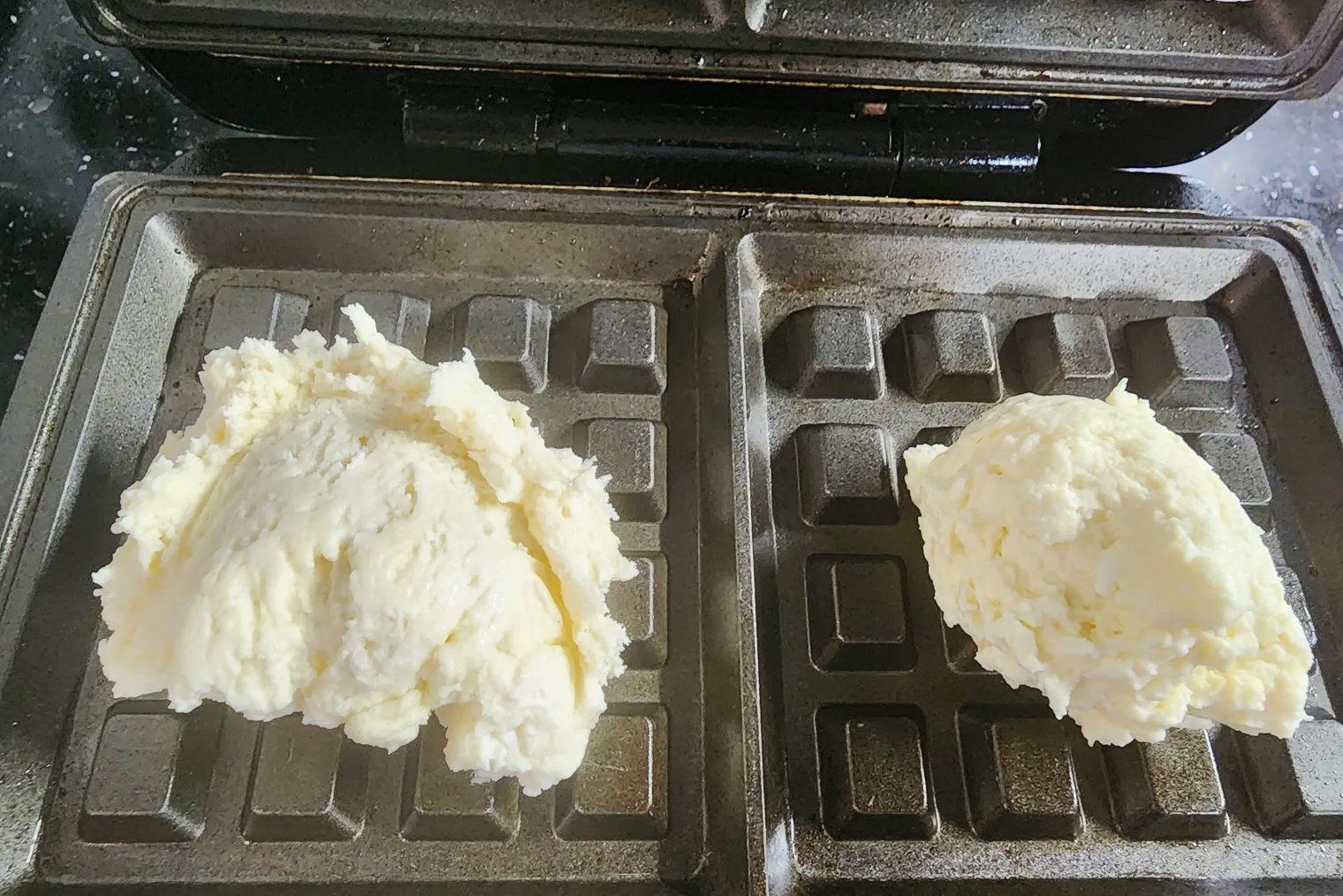 Ложкой взять творожную массу, положить в центр каждой части вафельницы и плотно закрыть крышку. Через минуту-две можно открыть и проверить готовность — мне нравится, когда вафли с корочкой, поэтому держу их подольше.
