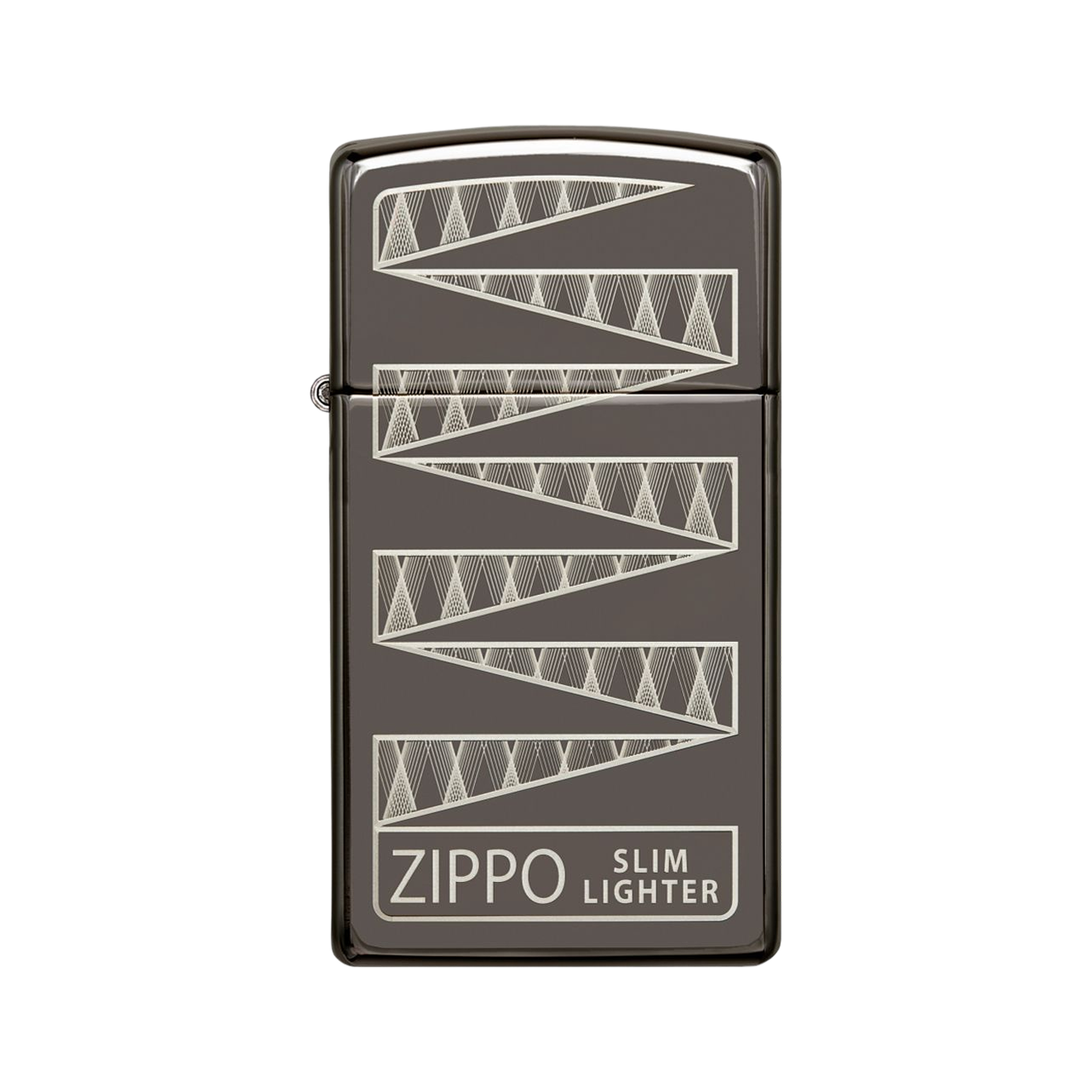 Линия зажигалок Slim вышла в 1956 году: модели отличались от классических Zippo легким и тонким корпусом. Для сравнения: ширина версии Slim примерно 0,38 дюйма (около 9,6 мм), а обычной — 0,5 дюйма (12,7 мм). В 2021 году, в честь 65-й годовщины коллекции, бренд выпустил коллекционную зажигалку. Лестница на ней отсылает к упаковке, в которой выпускались первые модели Slim