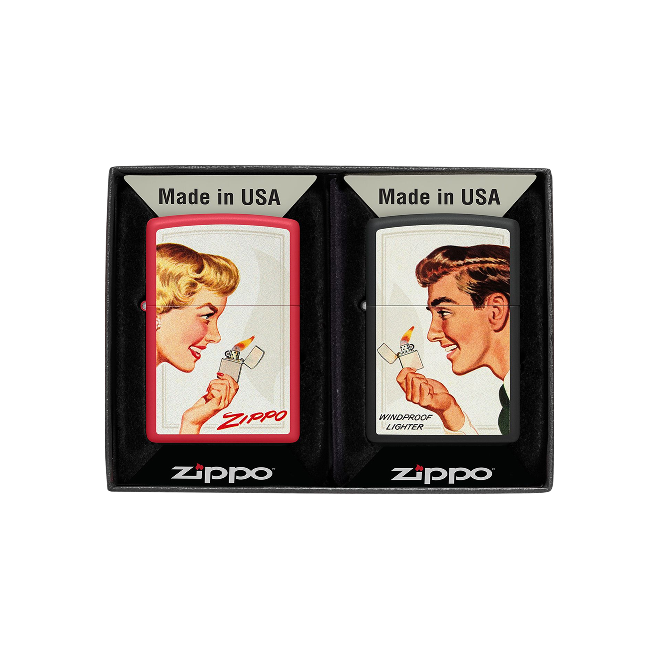 Изображения на парных зажигалках отсылают к американской винтажной рекламе. На оригинальном плакате 1948 года была надпись: The Gift That Never Fails — «Подарок, который никогда не подведет»